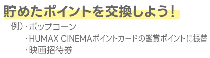 貯めたポイントはポップコーンやヒューマックスシネマ ポイントカードのポイント(映画鑑賞ポイント)と交換できます。