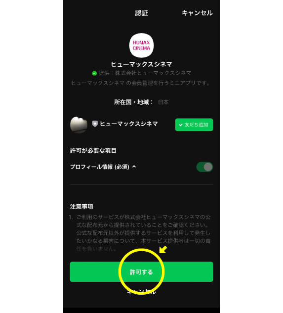 こちらの画面が出ましたら、下にある「許可する」を押してください。