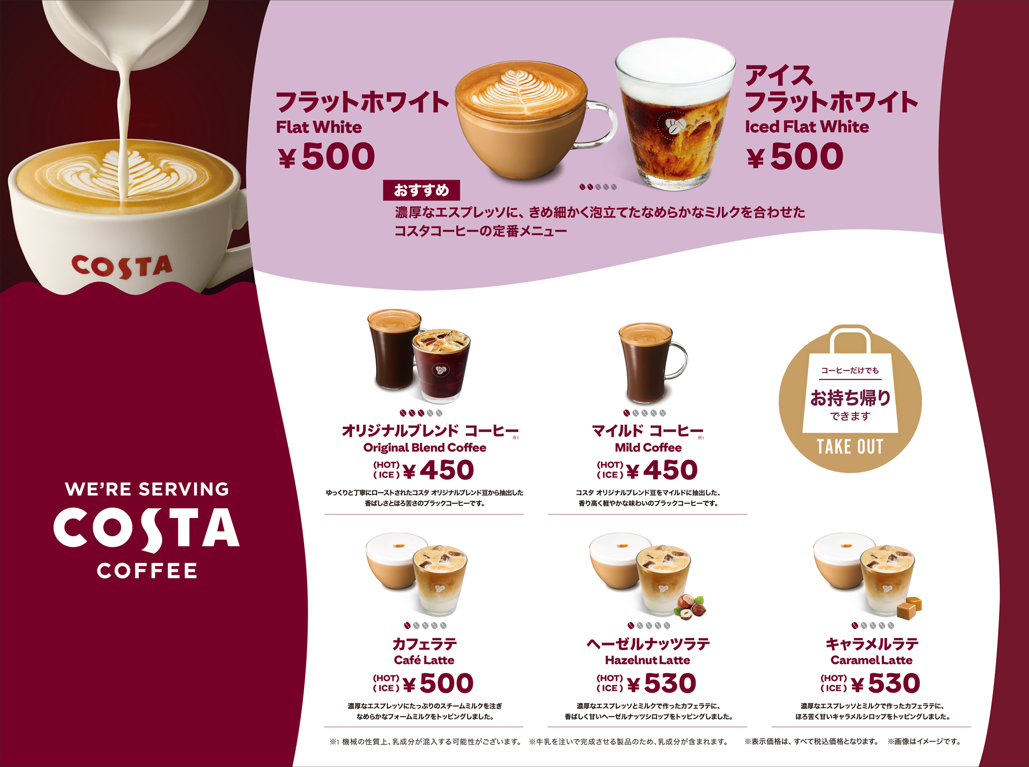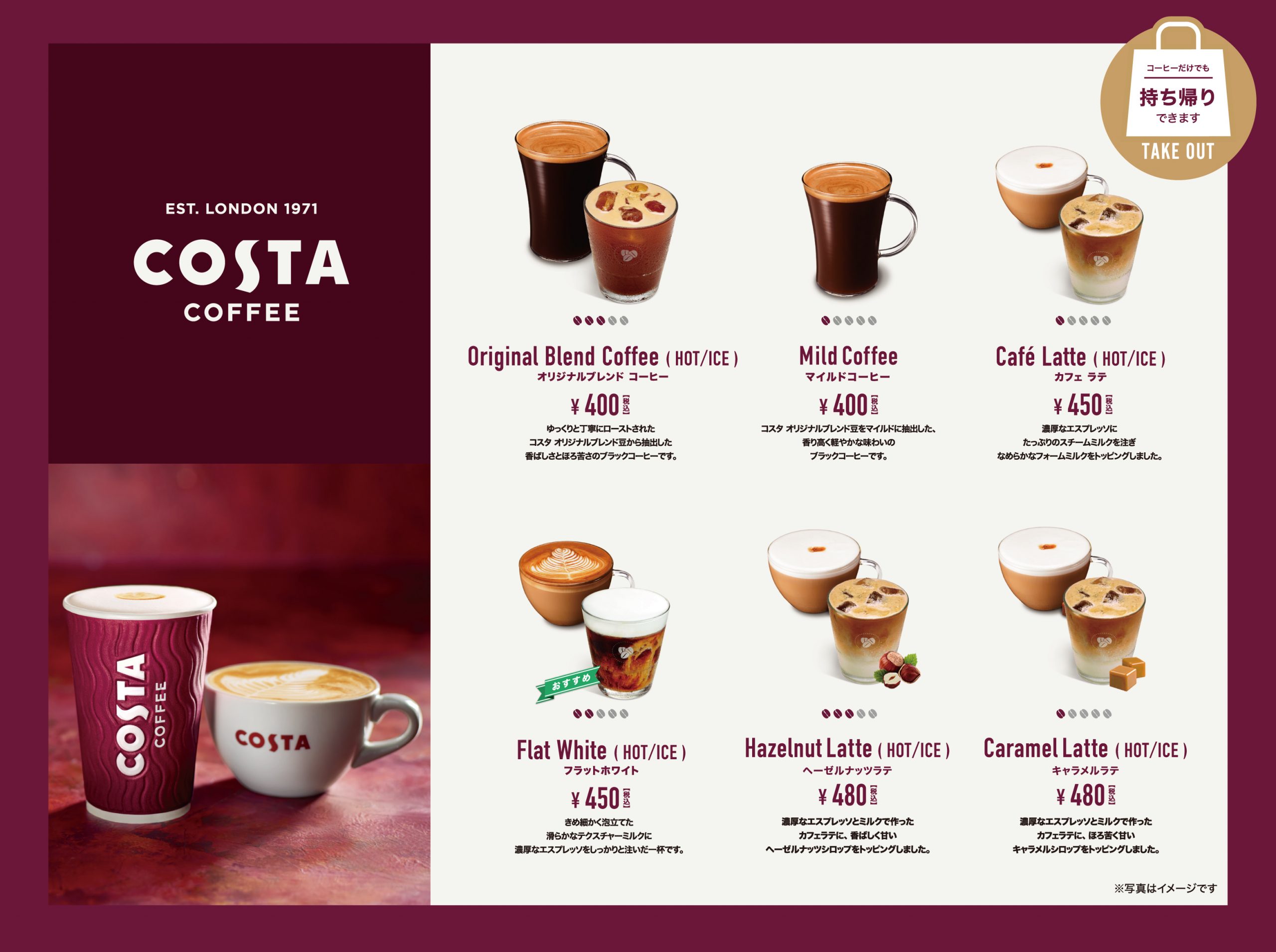 | コスタコーヒー ・オリジナルブレンドコーヒー ・マイルドコーヒー ・カフェラテ ・フラットホワイト・アイスコーヒー ・アイスカフェラテ ・アイスフラットホワイト・キャラメルラテ(ホット/アイス) ・ヘーゼルナッツラテ(ホット/アイス) | ¥450~¥530 |