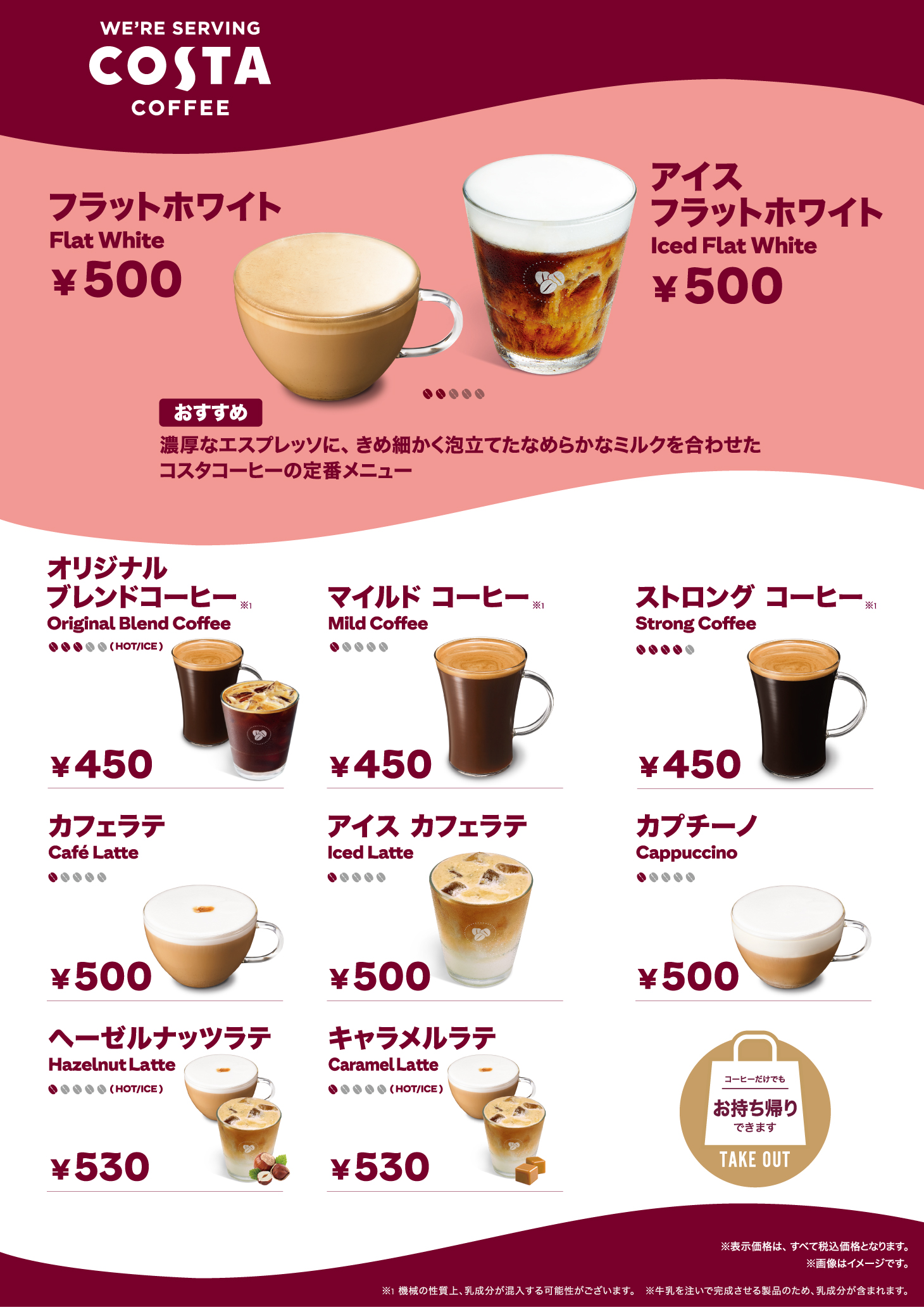 | コスタコーヒー ・オリジナルブレンドコーヒー ・マイルドコーヒー ・ストロングコーヒー ・カフェラテ ・フラットホワイト・カプチーノ ・アイスコーヒー ・アイスカフェラテ ・アイスフラットホワイト・キャラメルラテ(ホット/アイス) ・ヘーゼルナッツラテ(ホット/アイス) | ¥450~¥530 |