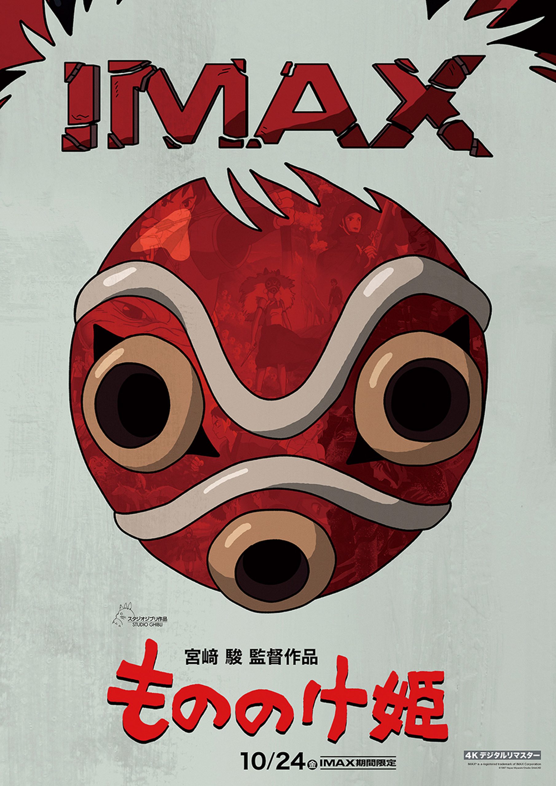 そして、今回のIMAX®劇場公開用のビジュアルでは、大胆にももののけ姫・サンが被る土面を大きくレイアウト。サンの悲しみと怒りを連想させる印象的なこの土面は『もののけ姫』を観たことがある人にはもちろん、これまで観たことがない人にも大きな衝撃を与え、作品への興味をそそられるものと思います。
