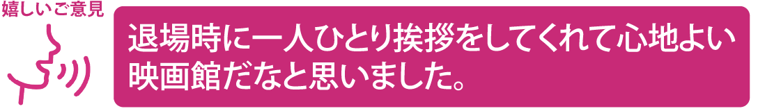 お褒めの言葉をいただきありがとうございます。貴重なお時間を使って映画館に来ていただいておりますので、お客様が気持ちよくご利用できるようスタッフ一同心よりの感謝を持ってご対応させていただきます。