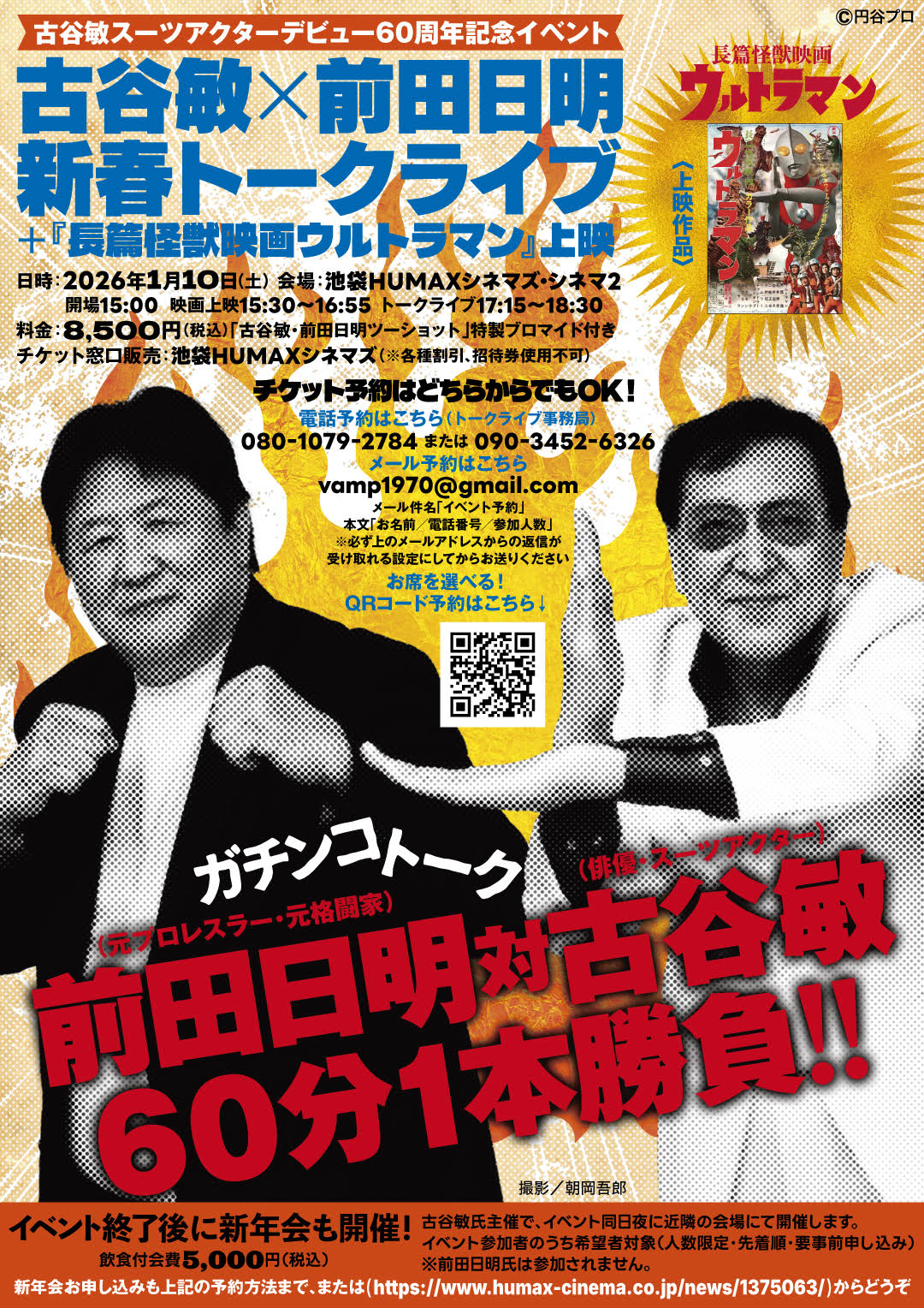 1/10(土)、新春!開運!古谷敏スーツアクターデビュー60周年記念イベント「『長篇怪獣映画ウルトラマン』上映」 + 「古谷敏 × 前田日明 トークショー」チケット好評販売中!!