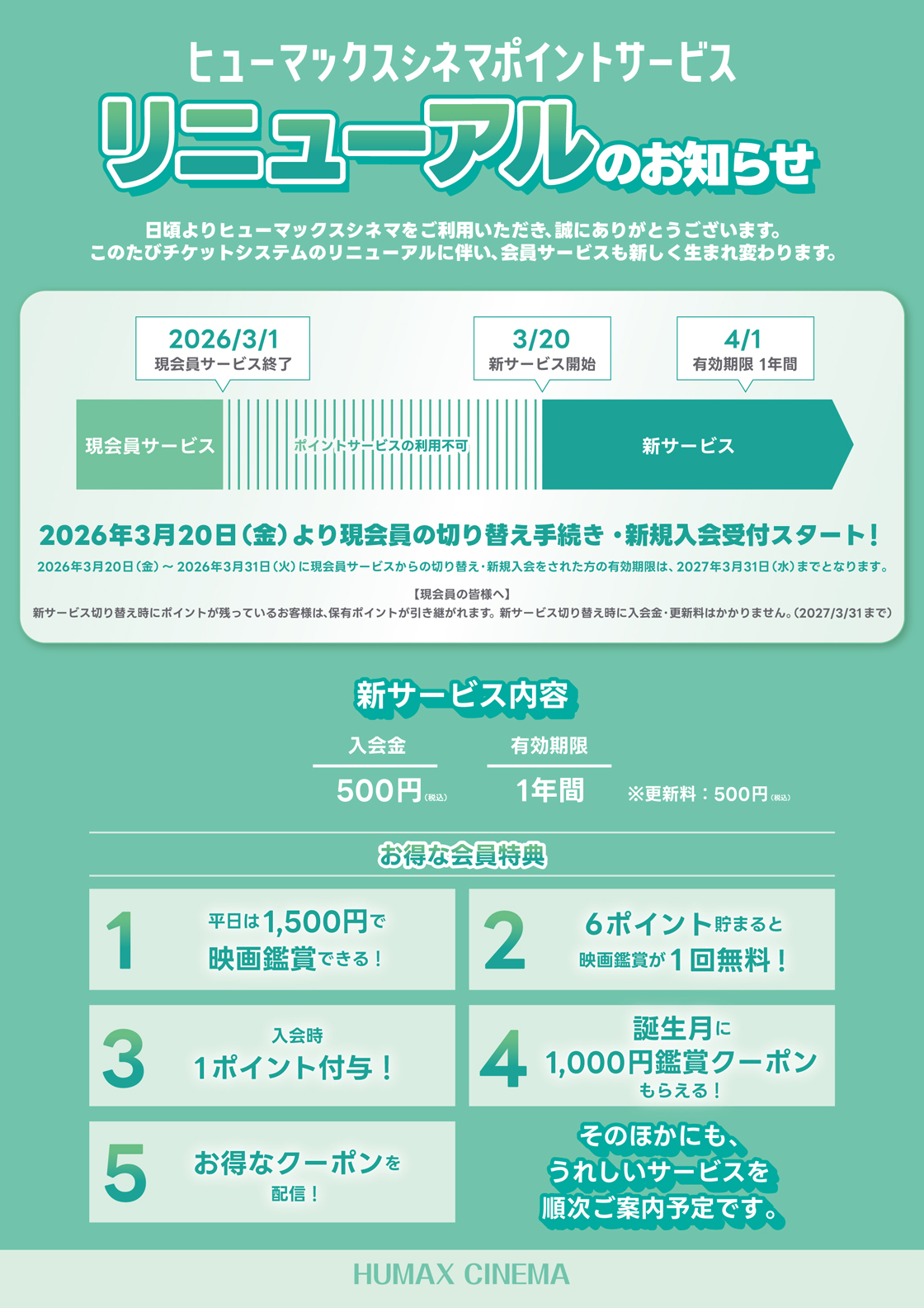 ヒューマックスシネマ ポイントサービスは、新しいチケットシステム導入に合わせ、より使いやすく快適な会員サービスをお届けできるようリニューアルいたします。