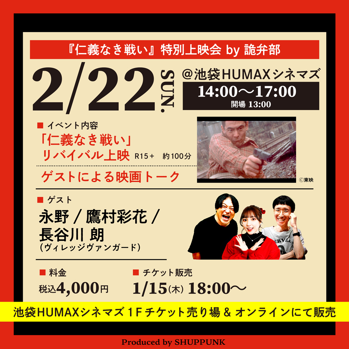 2/22(日)、永野・鷹村+長谷川の「第二回詭弁部的映画祭」『仁義なき戦い』特別上映会が決定いたしました。