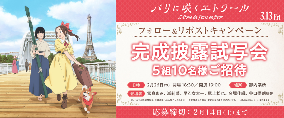 2月26日(木)、劇場アニメ『パリに咲くエトワール』キャスト&スタッフ登壇の完成披露試写会に 抽選で5組10名様をご招待!