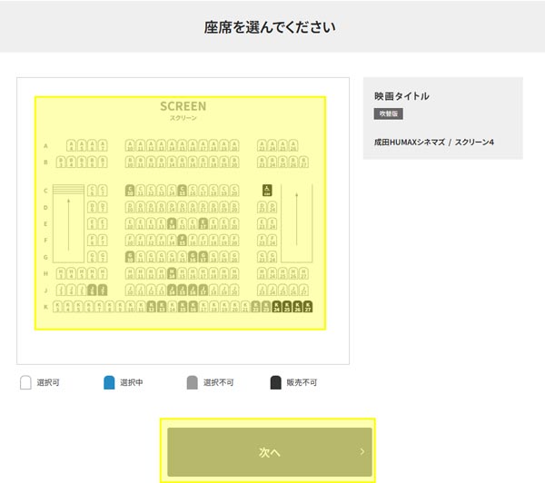 希望の座席を選択し、ボタンで次へ