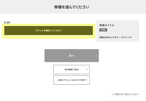 「チケットを選択してください」ボタンで次へ