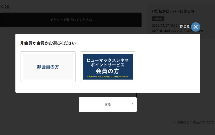 - ヒューマックスシネマカード会員番号入力、または非会員選択