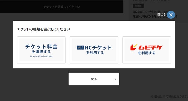 「HCチケットを利用する」「ムビチケを利用する」方は、購入情報入力画面に進みます。