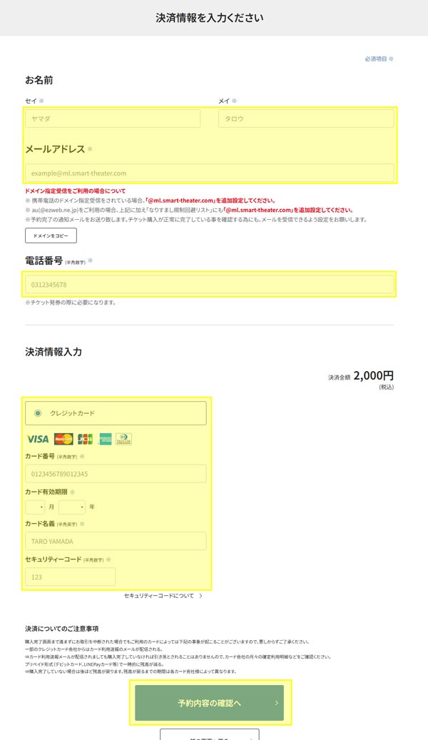 - お名前、お電話番号、メールアドレス、以下の決済情報を入力