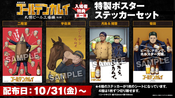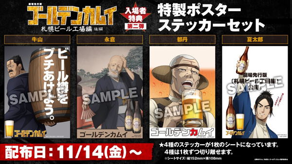 劇場先行版の舞台である「札幌ビール工場」に因んで描き下ろされた杉元たちのポスターステッカーは全16種!4種1セットを4回に分けて配布します。