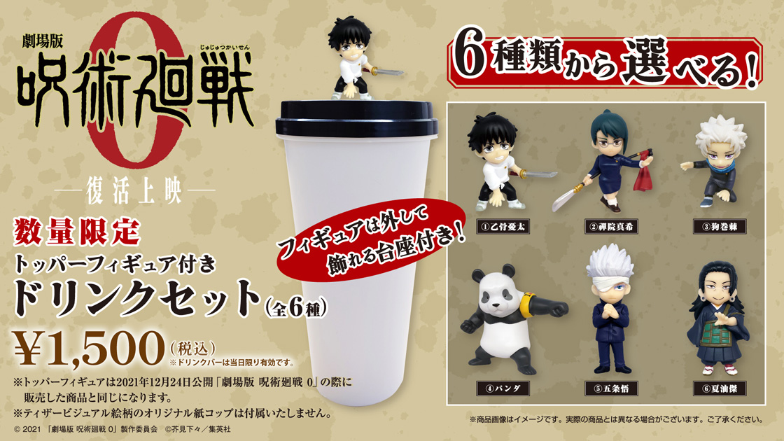 劇場版 『呪術廻戦0』-復活上映-を記念して、数量限定トッパーフィギュア付きドリンクセット(全6種)を販売します。